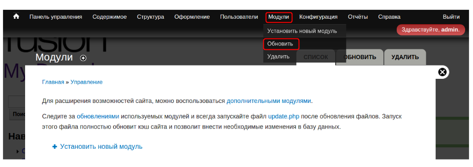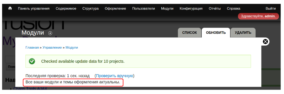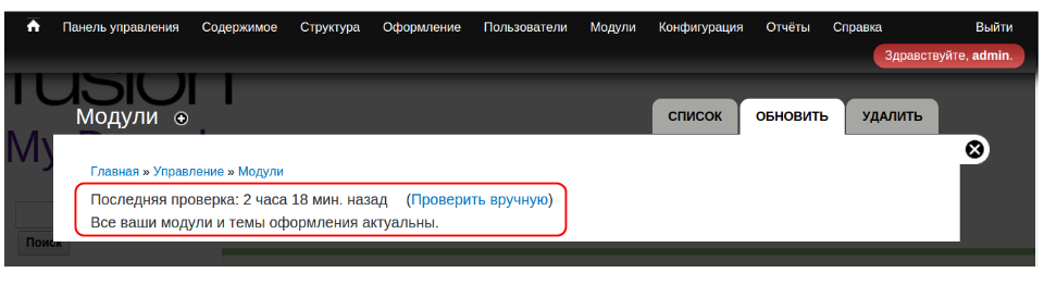 Чтобы увидеть, готовы ли обновления для ваших модулей, как и в случае с обновлением CMS Drupal, перейдите на вкладку “Модули” → “Обновить”. Drupal сам следит за появлением новых версий расширений: