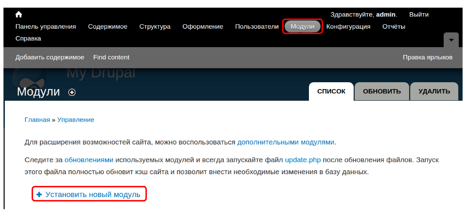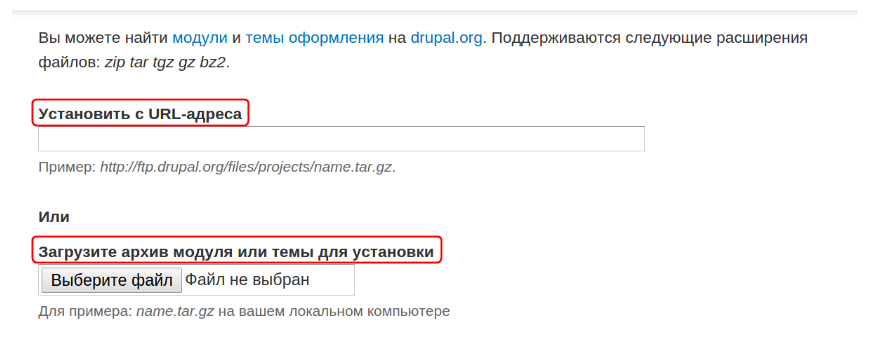Установить модуль можно как с URL-адреса, так и загрузив архив, скачанный на сайте drupal.org: