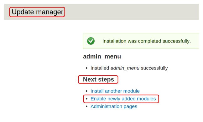 После установки модуля кликните на ссылку Enable newly added modules: