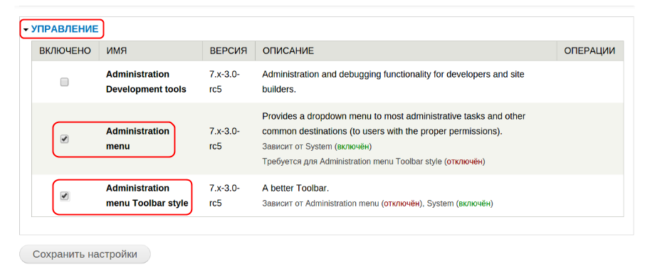 Здесь вы видите новую вкладку “Управление”. Здесь нужно поставить галочку напротив пунктов Administration menu и Administration menu Toolbar style:
