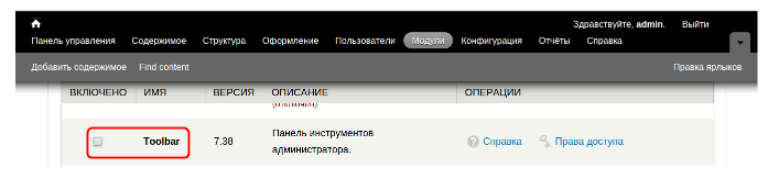 Прежде чем сохранить изменения, нужно отключить нынешнюю панель инструментов администратора. Найдите модуль Toolbar и снимите галочку напротив него: