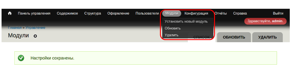 Чтобы удалить лишние модули, отключите их, а затем перейдите в раздел “Модули” → “Удалить”, выберите нужные и нажмите “Удалить”.