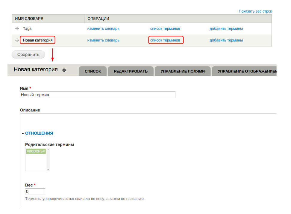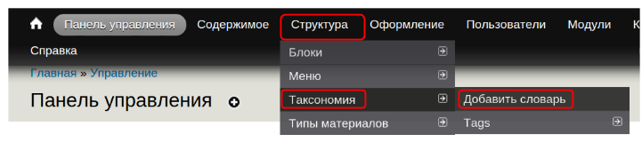 Чтобы создать словари и термины, перейдите в “Структура” → “Таксономия” → “Добавить словарь”: