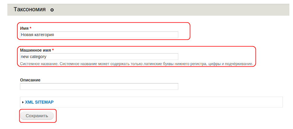 На открывшейся странице обязательно заполняем поле “Имя” и “Машинное имя”, а также ”Описание” по желанию: